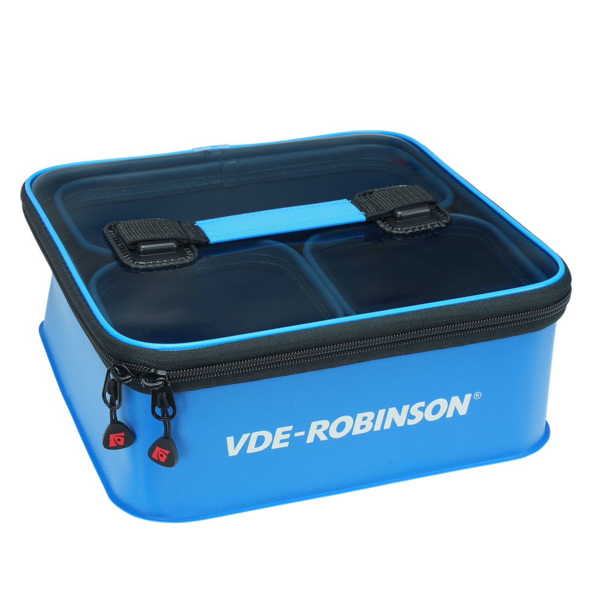 Zestaw pojemników EVA VDE-Robinson 74-EK-006 - kuweta z zamkiem i wewnętrznymi pojemnikami do przechowywania przynęt, zanęty i innych akcesoriów. Mocny materiał EVA, dno z jednego kawałka - bez klejeń. Zaokrąglone narożniki, które znacznie ułatwiają czyszczenie i opróżnianie wewnętrznym pojemników. Warto zwrócić też uwagę na nowy uchwyt transportowy na pokrywie – prosty detal, który znacznie ułatwia przenoszenie całego zestawu, zwłaszcza na dzikich, trudno dostępnych stanowiskach. W zestawie zamykana kuweta oraz trzy pojemniki wewnętrzne.
