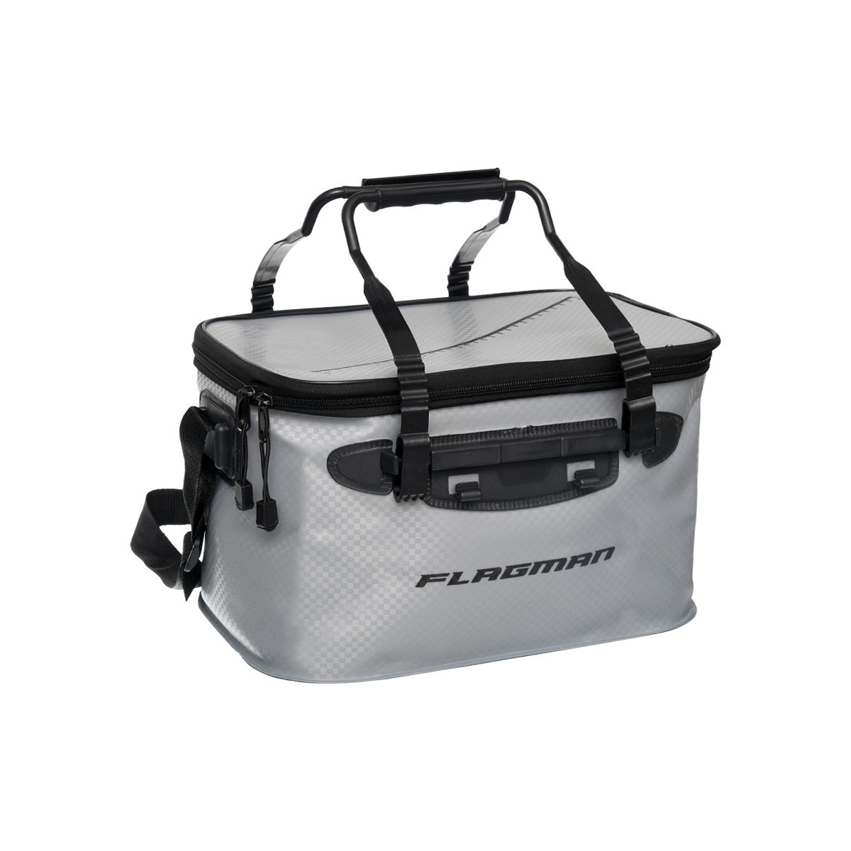 Torba Flagman Gray Woven Bag EVA - seria wodoodpornych toreb wykonanych z wytrzymałego materiału Woven EVA o specjalnej, wzmacnianej strukturze. W skład serii wchodzą cztery modele: 20L, 25L, 30L oraz 40L. Każdy model wyposażono w solidne zamknięcie na dwustronny zamek błyskawiczny. Na zewnętrznej części pokrywy znajduje się nadrukowana miarka umożliwiająca szybki pomiar długości ryby. Torby Flagman EVA Gray Woven Bag są łatwe do utrzymania w czystości, nie przepuszczają wody i nie chłoną zapachów. Zastosowane mocne uchwyty ułatwiają przenoszenie, a sama konstrukcja zapewnia wygodę podczas przechowywania i transportu.