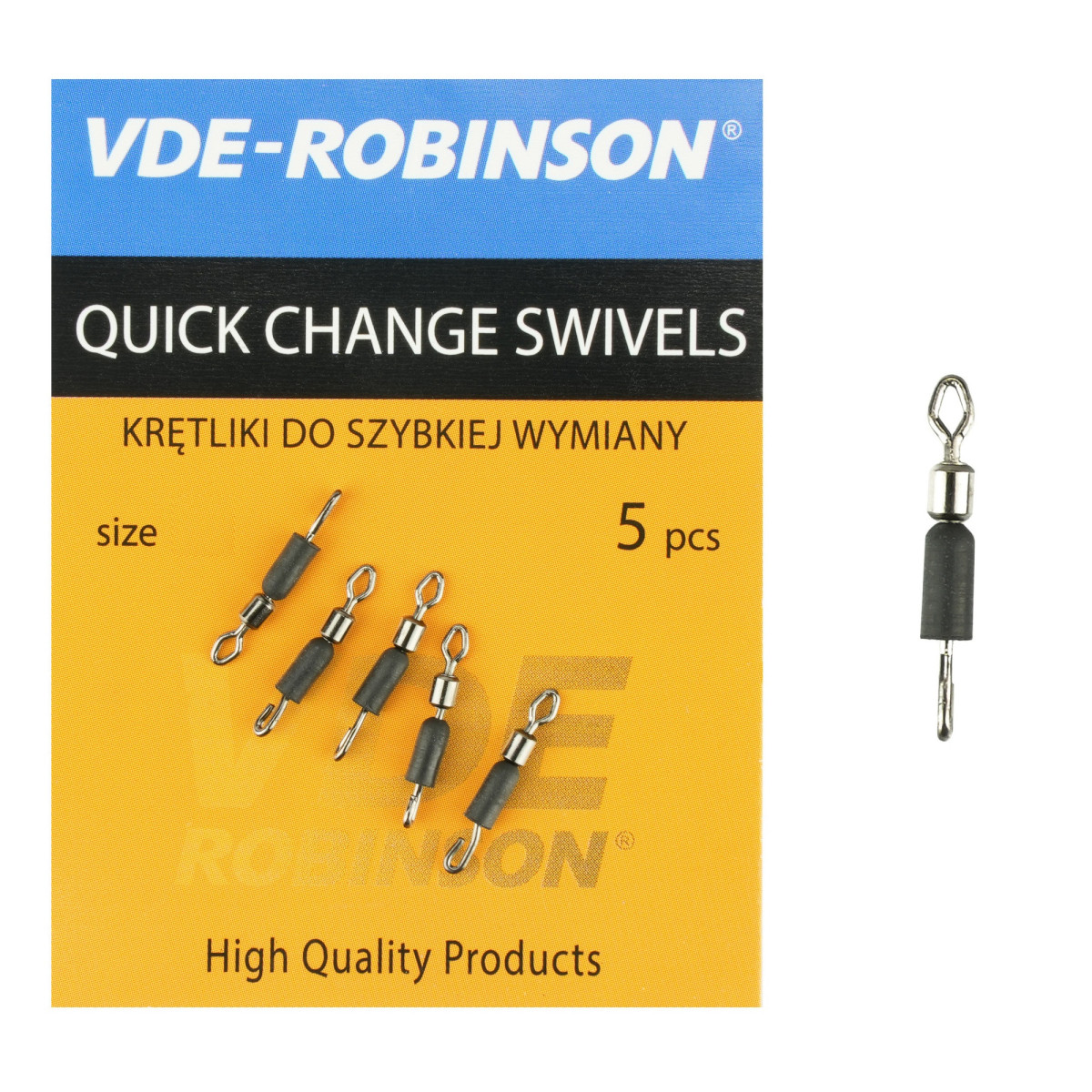 Łączniki VDE-Robinson Quick Change Swivels - bardzo wytrzymałe krętliki z szybkozłączką do szybkiej wymiany przyponów dedykowane do klasycznych zestawów feederowych. Gumowa nasadka umożliwia łatwą wymianę przyponu, a krętlik zapobiega skręcaniu się żyłki podczas łowienia. Dostępne w 3 rozmiarach: S, M oraz L.