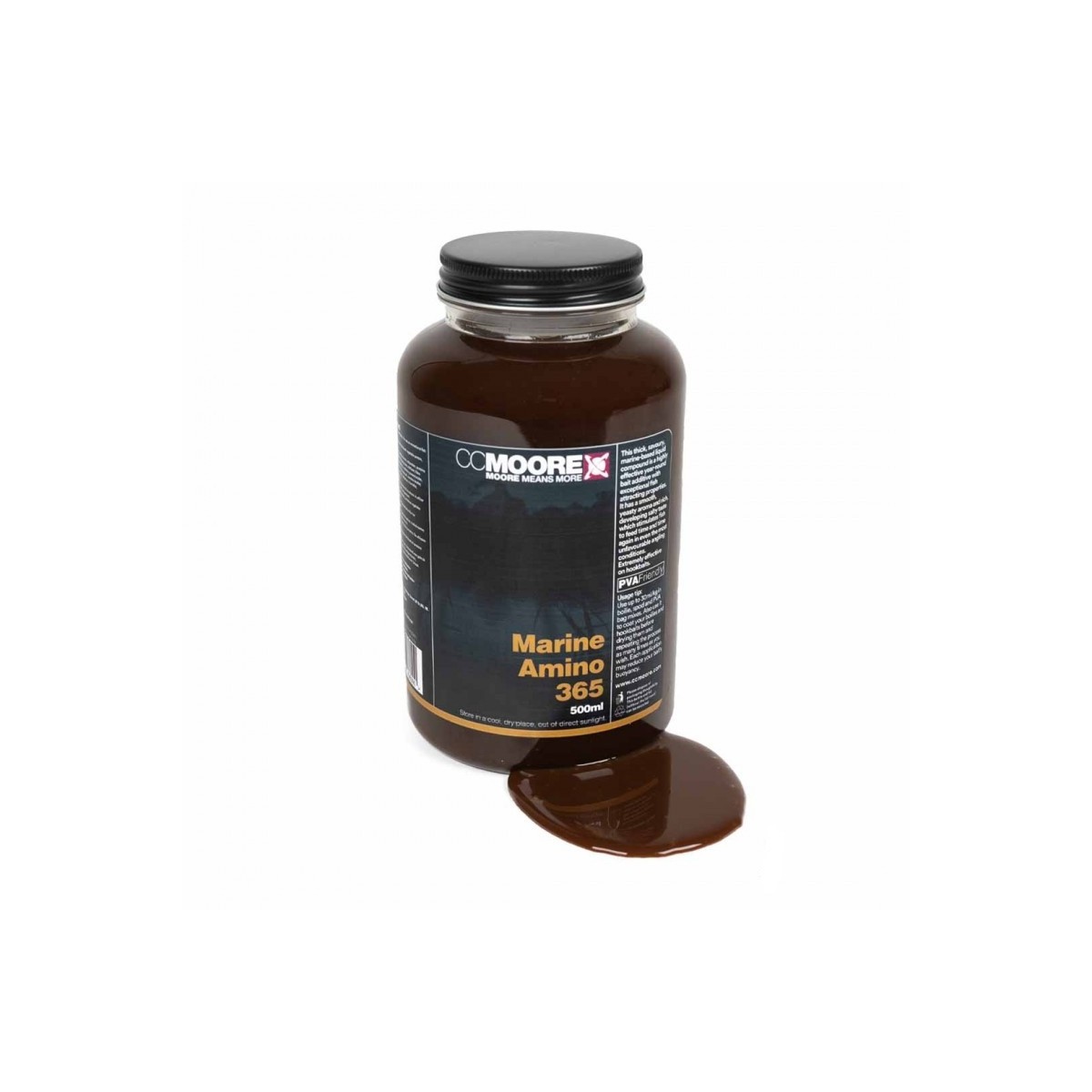 Liquid CC Moore Marine Amino - rozpuszczalny, rybny atraktor w płynie, zawierający połączenie silnych płynnych stymulatorów apetytu, które zwiększają atrakcyjność każdej przynęty – we wszystkich temperaturach wody. Doskonale sprawdza się jako zalewa do kulek proteinowych i przynęt haczykowych oraz jako dodatek do mieszanek do woreczków PVA. Po użyciu uwalnia intensywną, słono-rybną, rozpuszczalną chmurę atraktorów, która pobudza ryby do żerowania nawet w najtrudniejszych warunkach. Marine Amino 365 jest bezpieczny dla PVA. Produkt powstaje głównie z kombinacji silnie atrakcyjnych, skoncentrowanych, rozpuszczalnych oraz hydrolizowanych protein, dostarczających dużą ilość niezbędnych aminokwasów. Zostały one połączone ze sprawdzonymi bodźcami żerowymi, tworząc wyjątkowo skuteczny płynny dodatek zanętowy o bardzo dużej sile wabiącej.