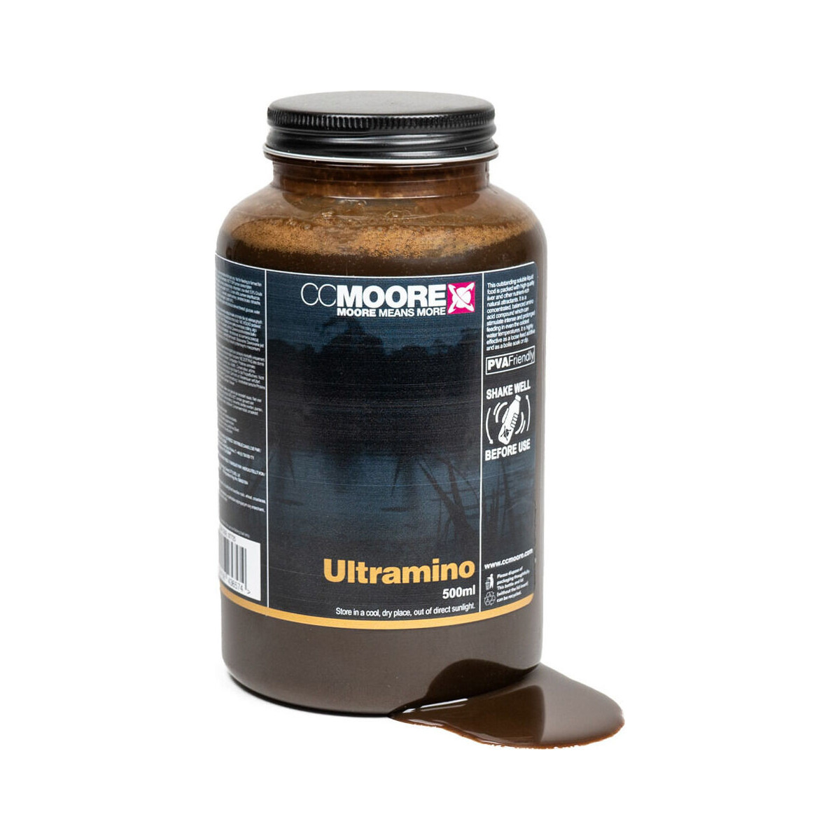 Liquid CC Moore Ultramino - bardzo dobrze rozpuszczalny, ciemnobrązowy koncentrat aminokwasów. Zawiera wątrobę, składniki mięsne oraz bogate w wartości odżywcze ekstrakty typu superfood, dzięki czemu jest wyjątkowo atrakcyjnym, naturalnym dodatkiem zanętowym. Charakteryzuje się gładkim, słodkim, drożdżowym profilem zapachowo-smakowym, który zwiększa atrakcyjność każdej przynęty. Doskonale sprawdza się do powlekania kulek proteinowych i przynęt haczykowych, a także jako booster do mieszanek PVA oraz zanęt sypkich. To bardzo skuteczny, całoroczny składnik kulek proteinowych, bezpieczny dla PVA.