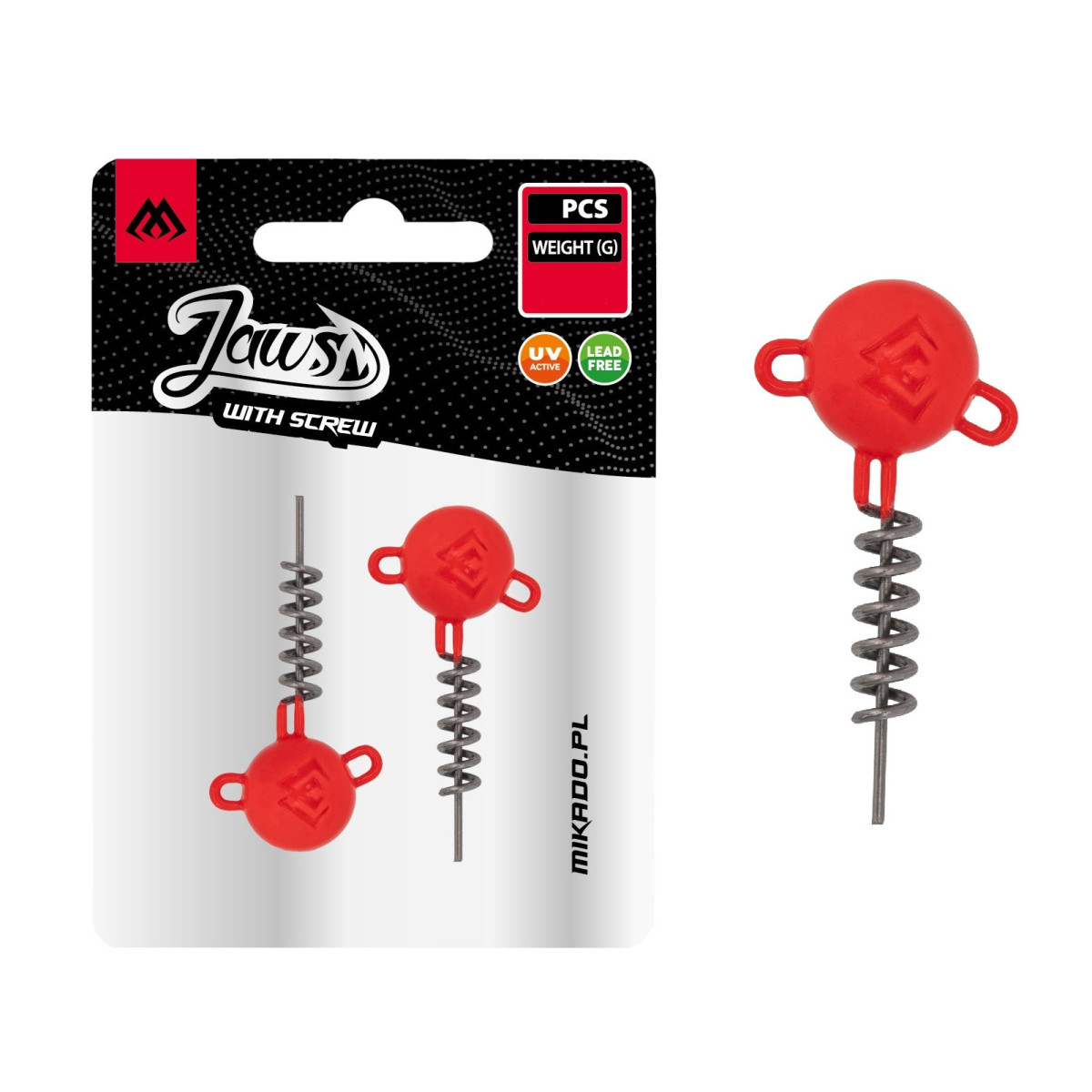 Wkręcane główki Mikado Jaws z wkrętem UV Orange - główka bez haka, wyposażona w sprężynę umożliwiającą wkręcenie przynęty, dzięki czemu utrzymuje się ona w jednej pozycji podczas dynamicznej animacji. Dodatkowo posiada oczko do łatwego montażu dozbrojki.