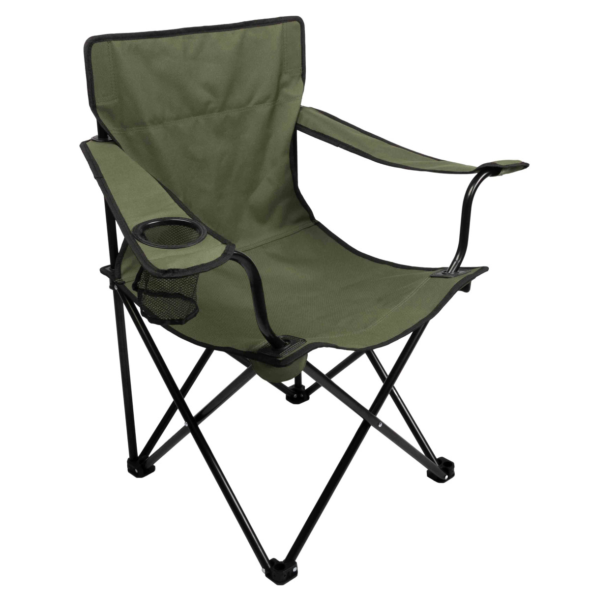 Krzesło Mikado składane zielone - IS11-2025-GR - składane krzesło z podłokietnikami i uchwytem na butelkę. Kompaktowy design i pokrowiec sprawiają, że jest idealne na wszystkie wyprawy, zapewniając komfort i wygodę każdemu wędkarzowi.