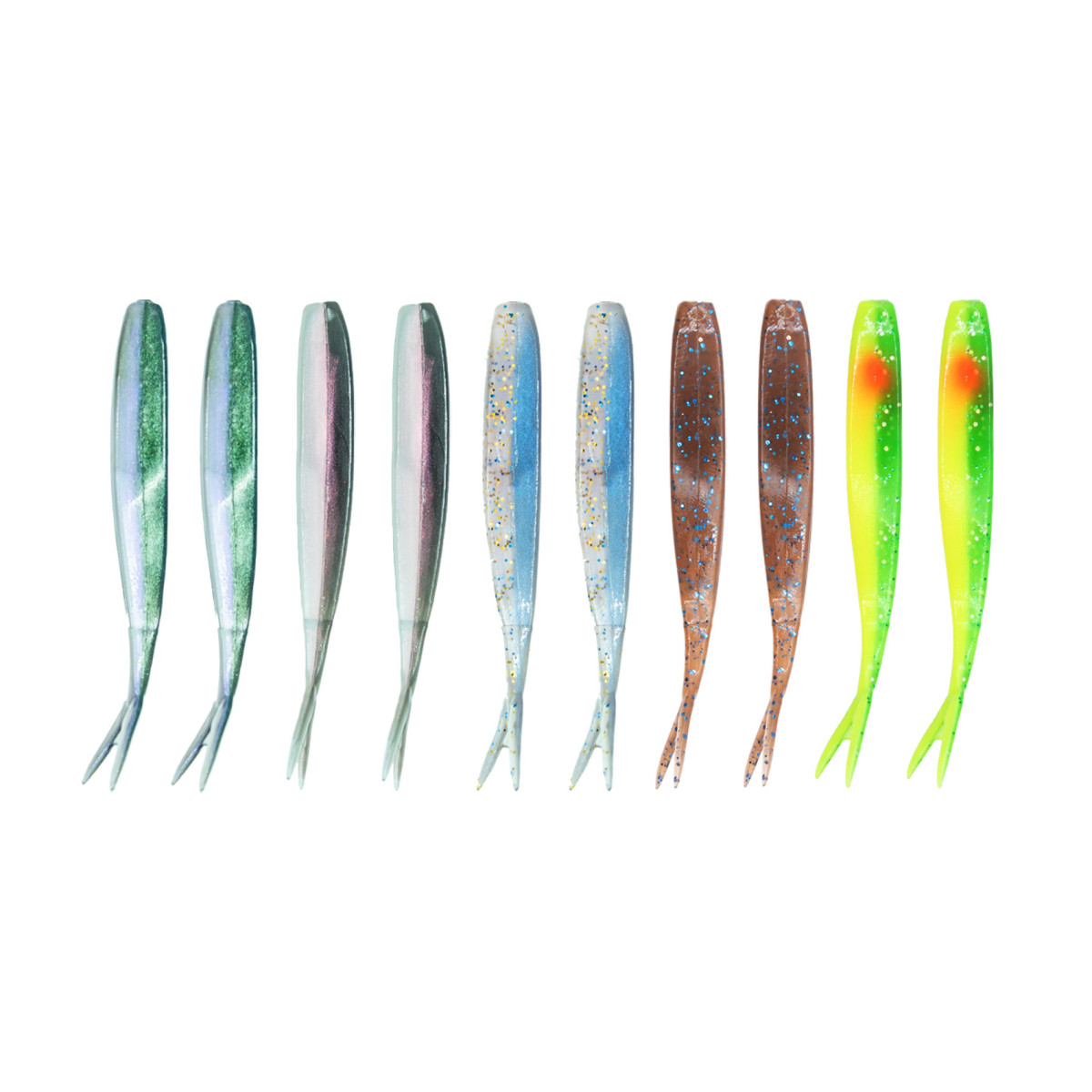 Zestaw gum Solum Rebel Lures V-Tail 7.5cm - MIX - zestaw przynęt typu jaskółka, będących doskonałą propozycją dla miłośników łowienia okoni oraz pstrągów i sandaczy. Specjalny otwór w korpusie sprawia, że guma łatwo się składa ułatwiając rybie jej zassanie. Dodatkowo, odchudzona w ten sposób część ogonowa, poprawia zachowanie przynęty, jednocześnie umożliwiając jej naturalną pracę. Doskonale sprawdzają się w klasycznym zestawieniu z trójkątnymi główkami, ale również w zestawie drop shot. Zestaw zawiera 10 gum w 5 kolorach: NO - Natural Olive, ND - Natural Dark, BS - Blue Sparkling, TBG - Tea & Blue Glitter oraz NRD - Neon Red Dot.