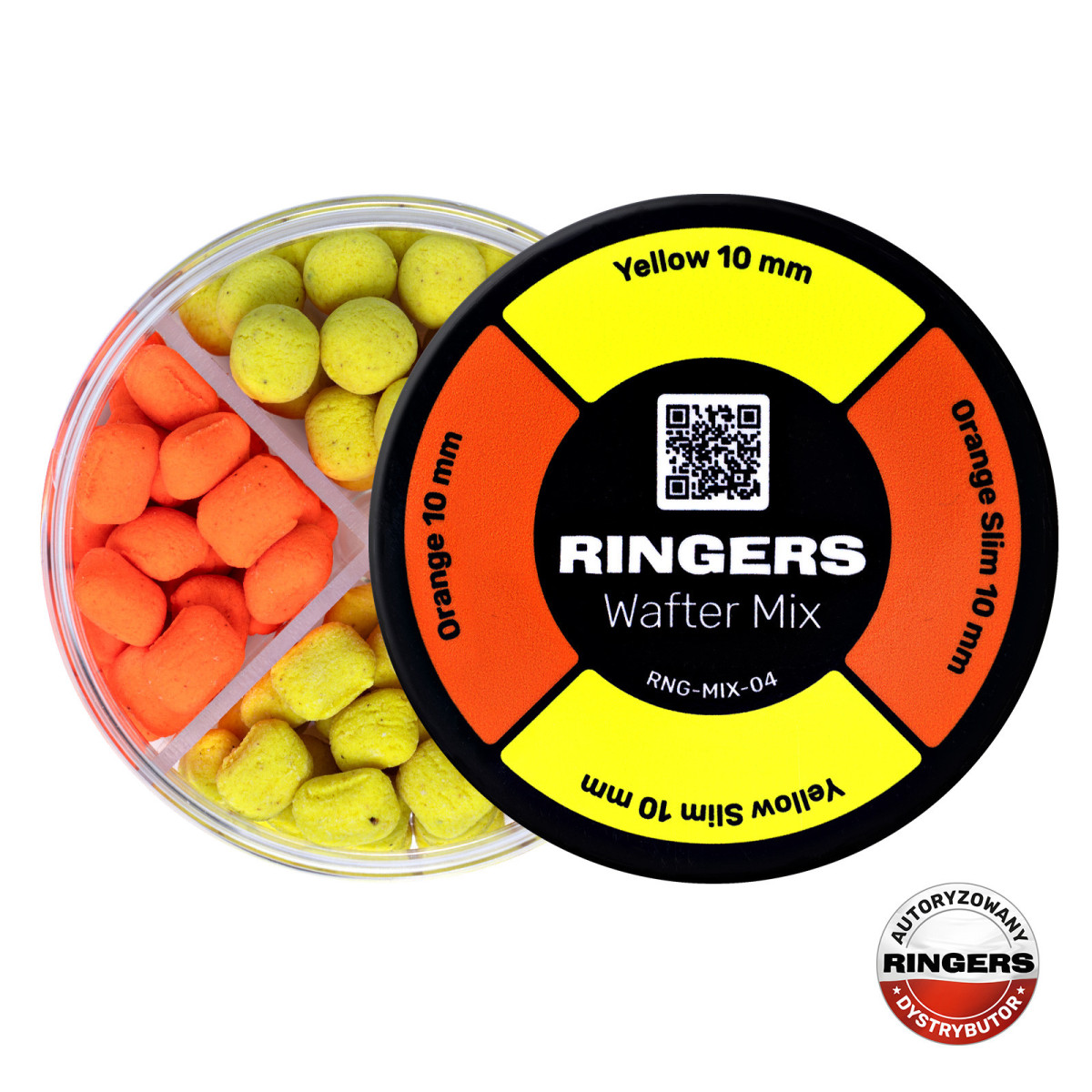 Mix składa się z 4 rodzajów przynęt Ringers Wafters: Orange 10mm & 10mm Slim, Yellow 10mm & 10mm Slim.