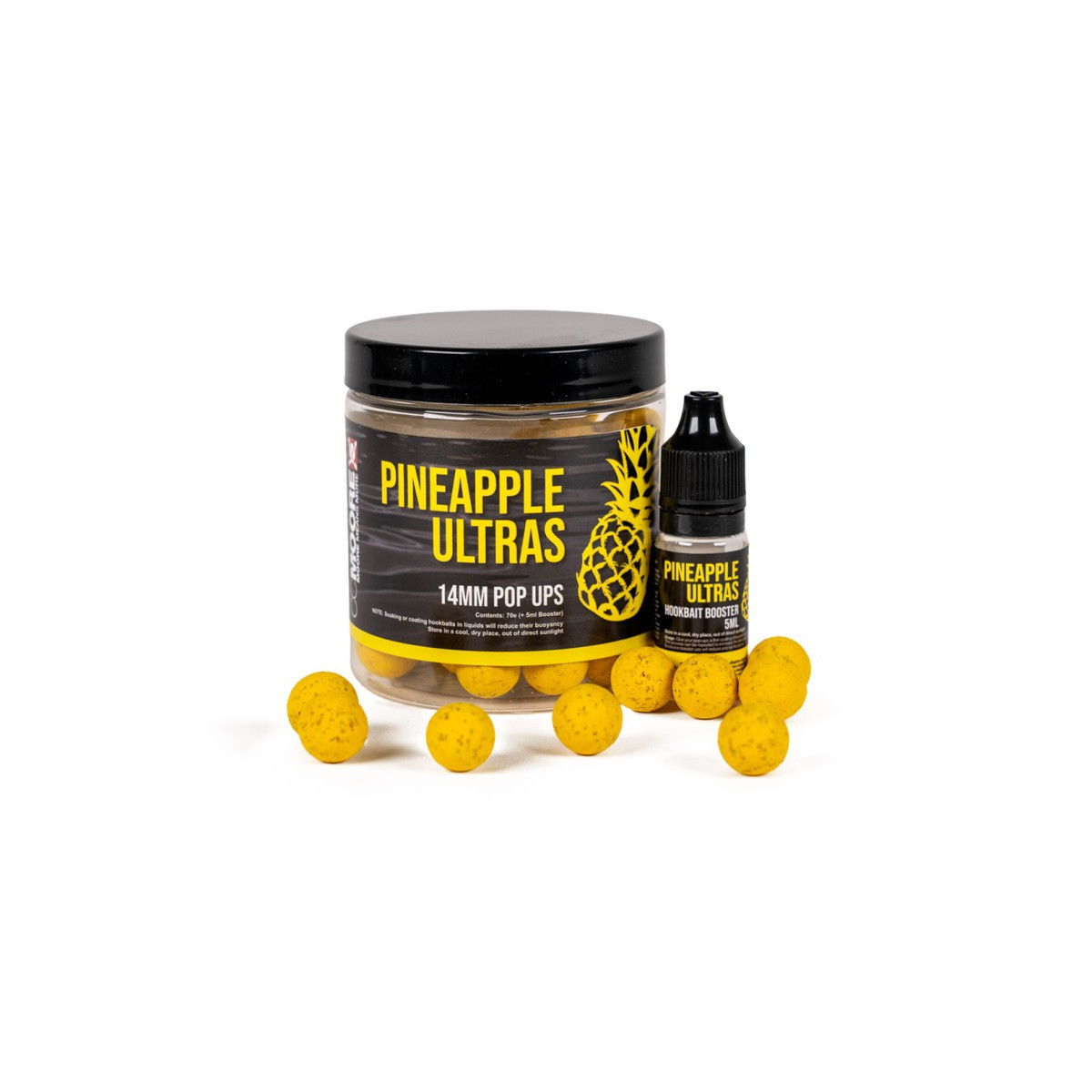 Pineapple Ultras to efekt długiego procesu opracowywania, którego celem było stworzenie możliwie najbardziej dopracowanego i unikalnego zestawu atraktorów o zapachu ananasa. Zawierają kluczowe, autorskie komponenty CC Moore – aromaty, substancje słodzące oraz olejki eteryczne – dzięki czemu ta specjalistyczna przynęta haczykowa natychmiast przyciąga ryby przez długi czas. Kulki zawierają dodatkowo pył korkowy, który zwiększa i stabilizuje ich wyporność, umożliwiając utrzymanie dużych haków przez 48 godzin i dłużej, zapewniając stabilną pracę zestawu. W każdym opakowaniu znajduje się buteleczka 5ml boostera do przynęt haczykowych, zawierającego ten sam pakiet atraktorów co kulki Pineapple Ultras. Daje to możliwość dodatkowego wzmocnienia aromatu i smaku oraz zwiększenia intensywności uwalniania sygnałów w wodzie.