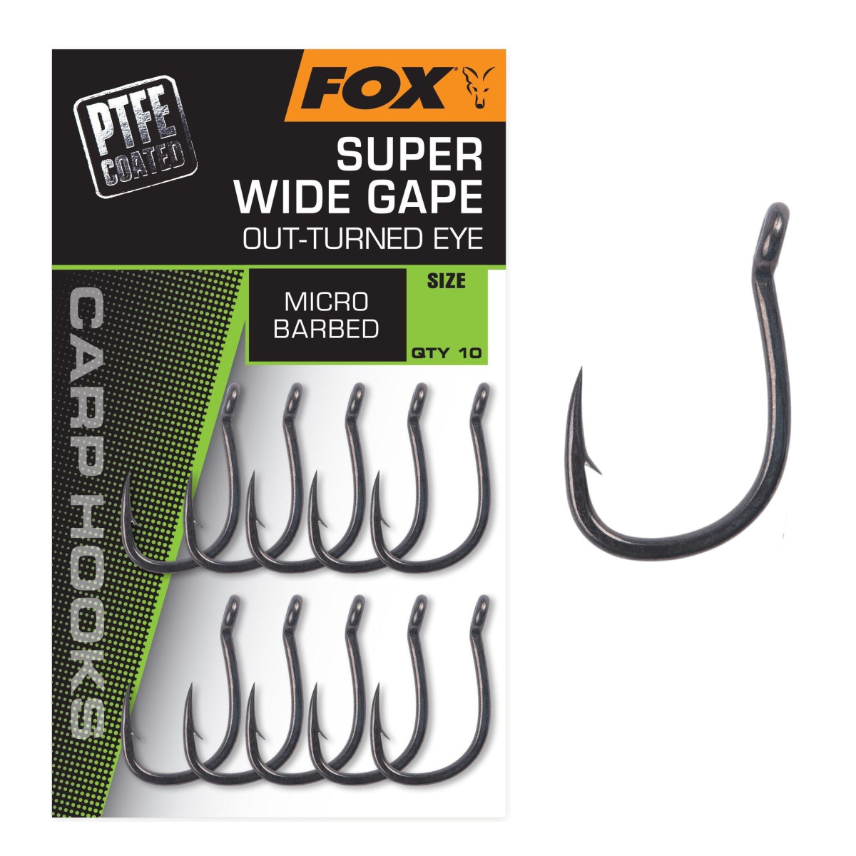 Haczyki Fox PTFE Super Wide Gape Outturned Eye - haczyki wyprodukowane zgodnie z dokładnymi wzorami w ramach serii premium Fox Edges Arma Point. Cechują się antyrefleksyjną powłoką teflonową dla ograniczenia widoczności, wytrzymałymi ostrzami dla lepszego zacięcia oraz trwałą konstrukcją z kutej stali, co sprawia, że haczyki te zapewniają wyjątkową wytrzymałość i trwałość. Dostępne w niezwykle niskiej cenie, oferują bezkonkurencyjny stosunek jakości do ceny.