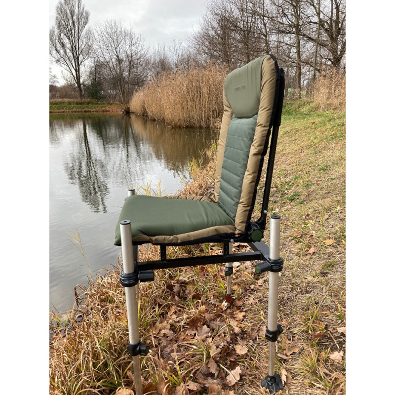 Warto zwrócić również uwagę na to, że każda z nóżek fotela CUZO Quantum jest zakończona klasycznym gwintem. Dzięki temu rozwiązaniu mamy możliwość bezpośredniego montażu jednej z wielu podpórek wędkarskich.