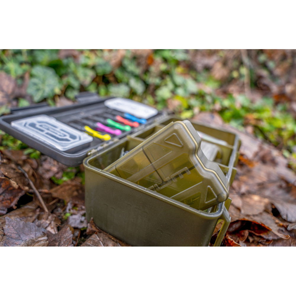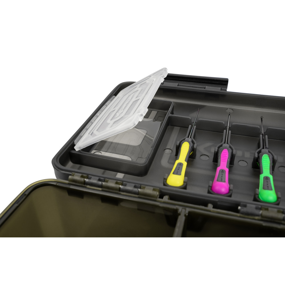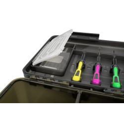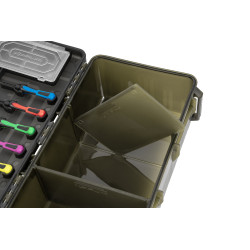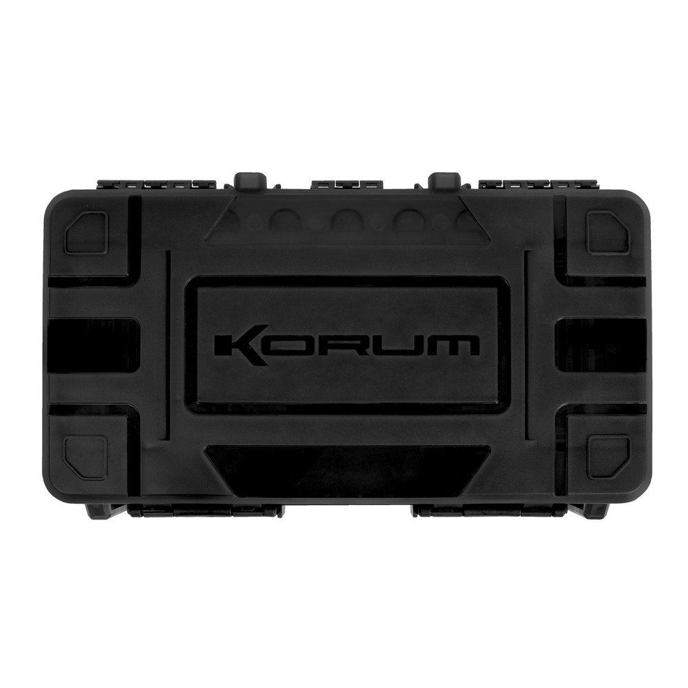 K0290085 Pudełko Korum Roving Blox - Fully Loaded - to nowy pomysł na przechowywanie sprzętu wędkarskiego, skierowany do wszechstronnych wędkarzy. Tak skonstruowany, aby zmieścić w jednym, dobrze zorganizowanym miejscu wszystko to, czego potrzebujesz. Starannie dobraliśmy wielkość BLOX'a, aby pomieścić niezbędne elementy sprzętu wędkarskiego, takie jak szpulki żyłek, paczki haczyków oraz akcesoria. Jeśli potrzebujesz przegródek, możesz użyć specjalnego pudełka BITS BLOX, a w pokrywie możesz umieścić drobne akcesoria. Narzędzia do przynęt łatwo można umieścić na swoim miejscu, a główne pudełko można dopasować do własnych potrzeb za pomocą przegródek. Jeśli chcesz, możesz również umieścić w nim RIG BLOX, który zabezpiecza wszystkie przypony przed niekorzystnymi warunkami atmosferycznymi. To wszystko w jednym pudełku!