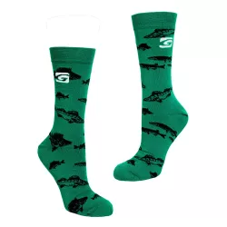 Skarpety Graff 064 - wykonane z naturalnej bawełny o podwyższonej wytrzymałości na ścieranie, posiadają naturalne właściwości oddychające oraz zapewniają izolację cieplną i uczucie suchości. Specjalnie zaprojektowany kształt zapobiega zsuwaniu się skarpetek, a ich wysokość gwarantuje ochronę przed obtarciami, nawet przy noszeniu wysokich butów. Motyw skarpetek to połączenie wód oraz ryb słonowodnych i słodkowodnych. Skarpetki są pakowane po dwie pary (2-pack).