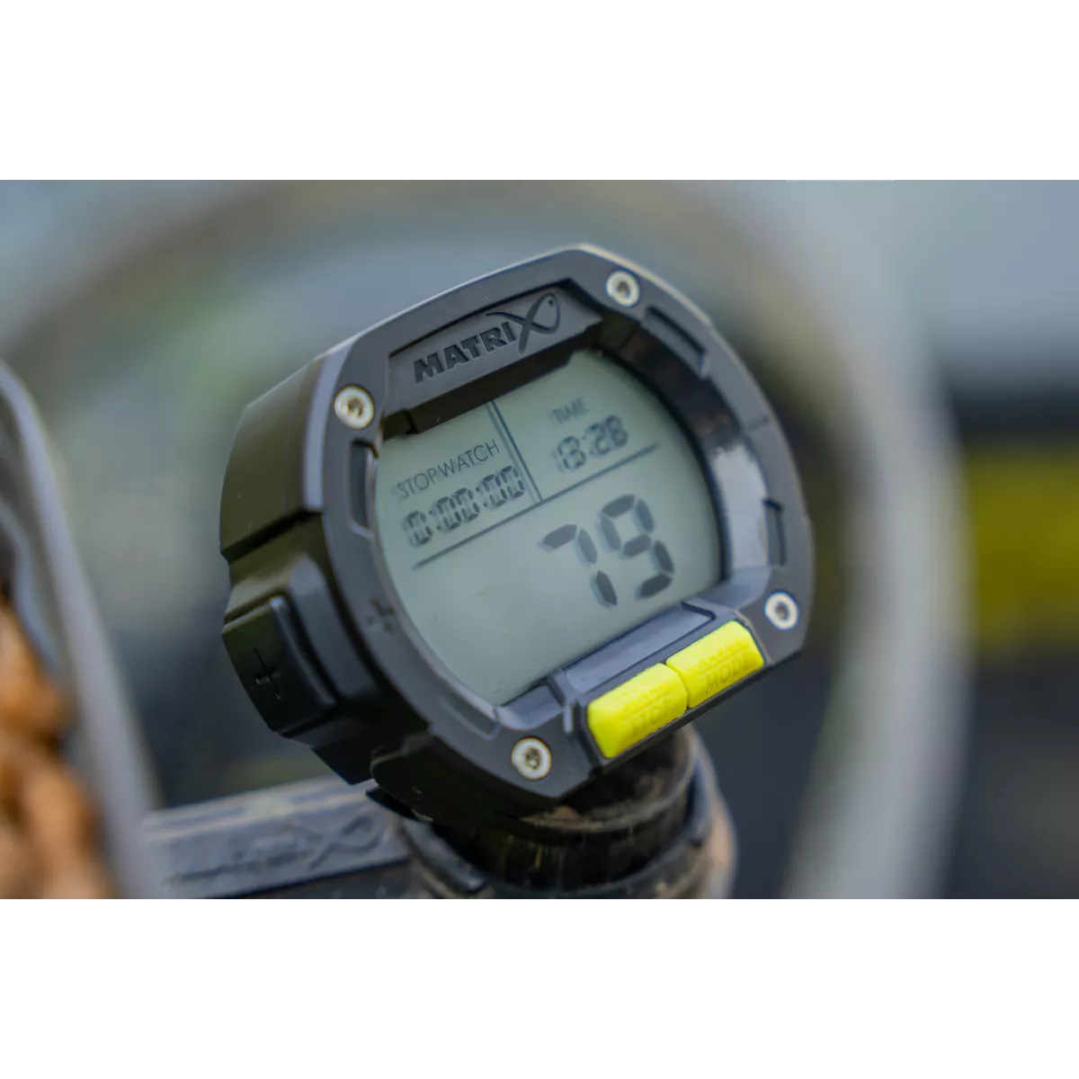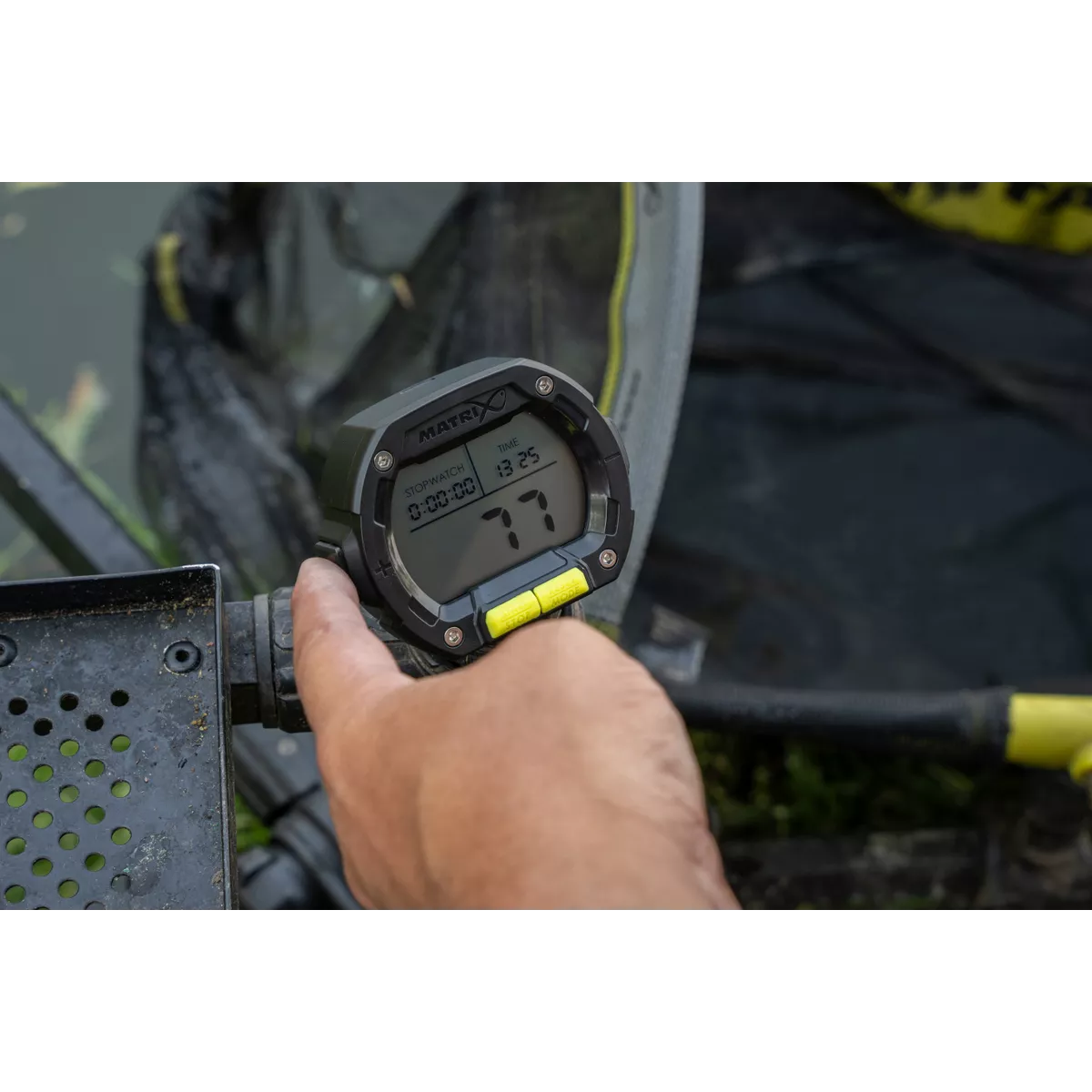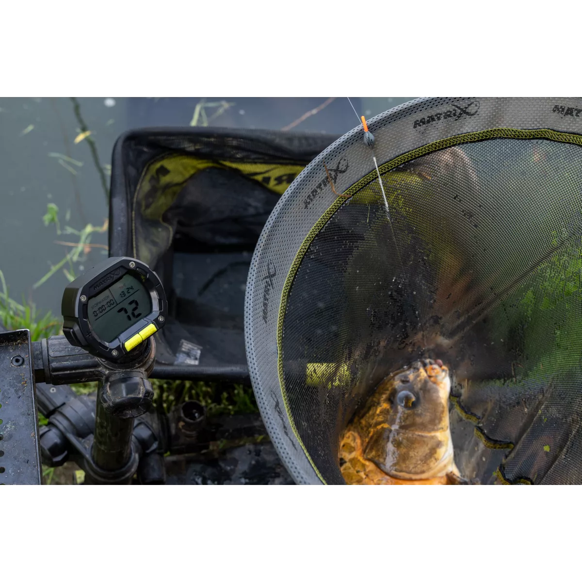 - Wyświetlacz pokazuje czas, stoper oraz wagę lub liczbę ryb