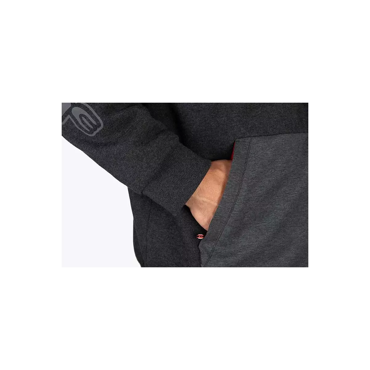 - Strona z klasycznym wykończeniem: podwójny zamek, kontrastujące szare kieszenie zapinane na zamek z przodu