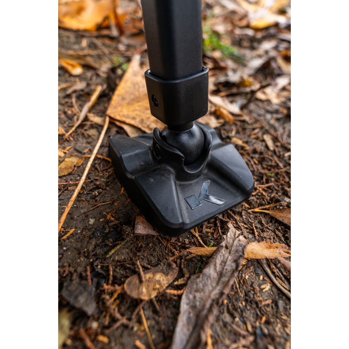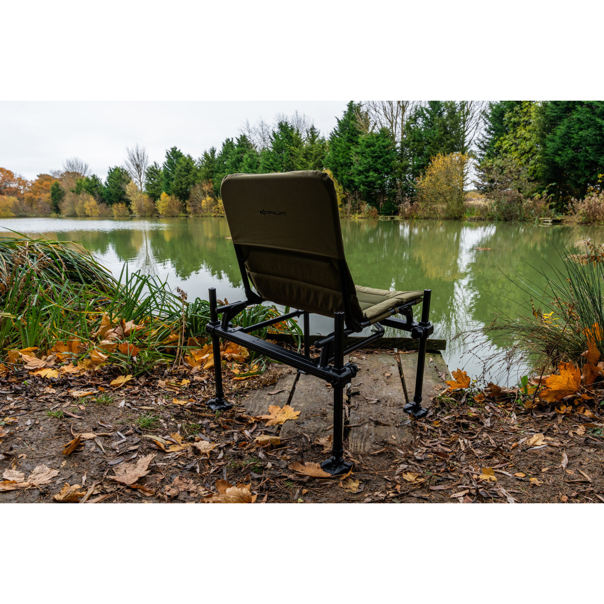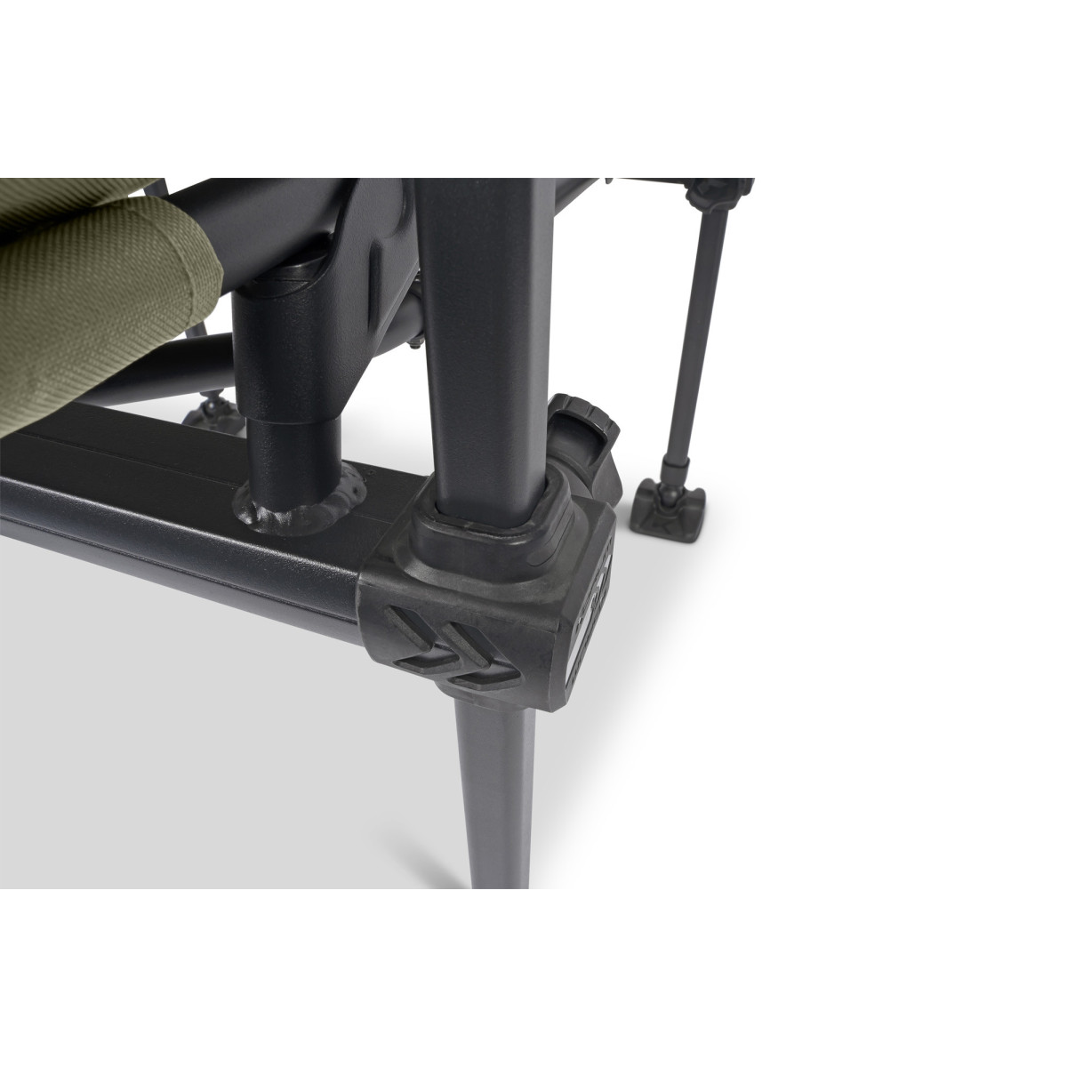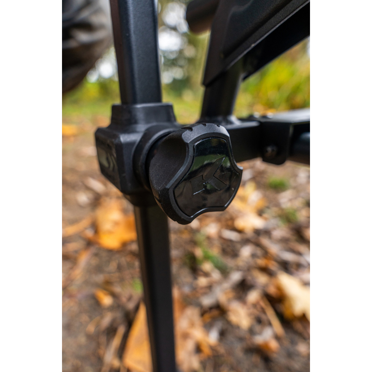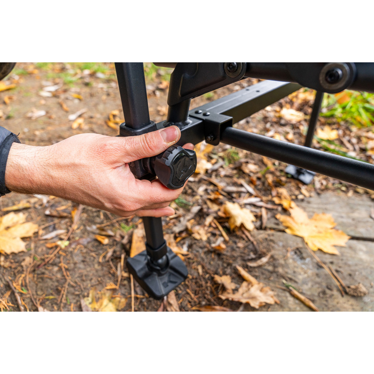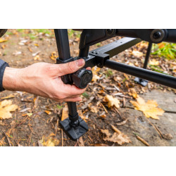 Fotel Korum S23 wykorzystuje opatentowaną, pionową konstrukcję nóg, co zapewnia niezwykłą stabilność. Szeroki stopki zabezpieczą krzesło przed wbijaniem się w grunt.